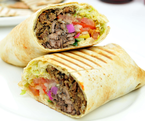 Հյութալի խոզի միս, թարմ բանջարեղեն, սոուս և փափուկ լավաշ։