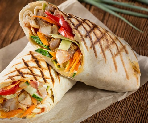 Նուրբ մարինացված հավի միս, թարմ բանջարեղեն, սոուս և փափուկ լավաշ։